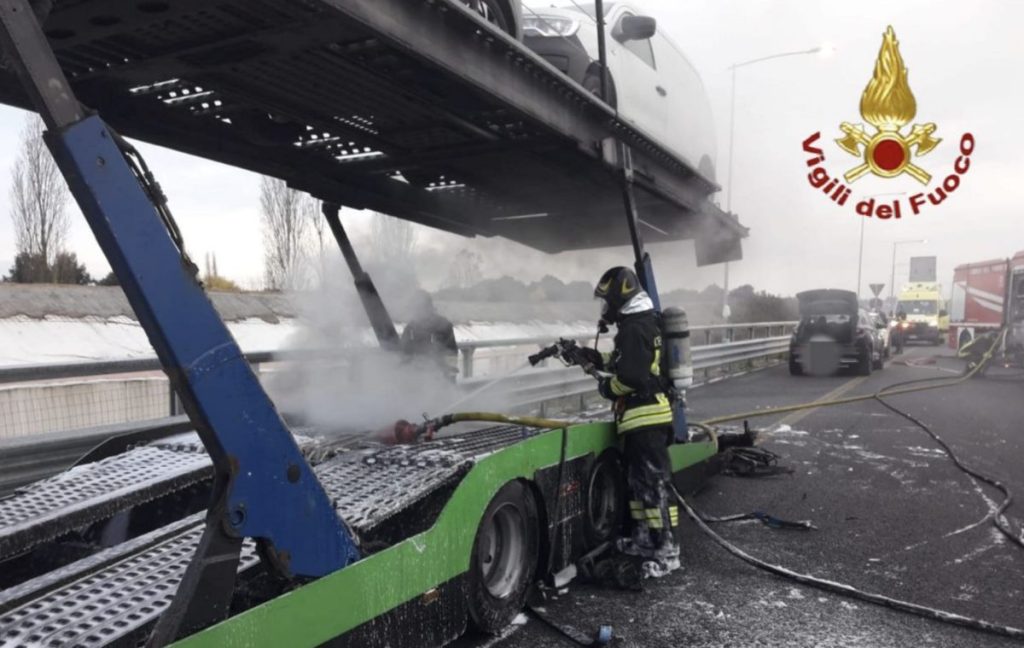 Peschiera, camion bisarca in fiamme sull’A4: traffico bloccato e manovra decisiva dell’autista